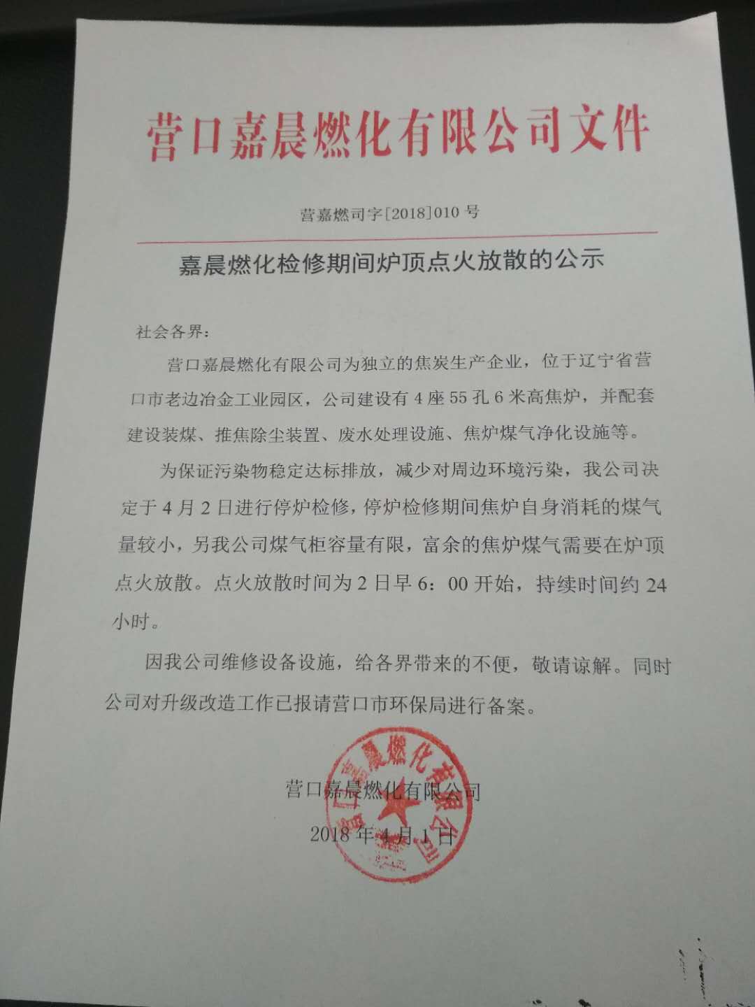 營(yíng)口嘉晨燃化檢修期間爐頂點(diǎn)火放散的公示