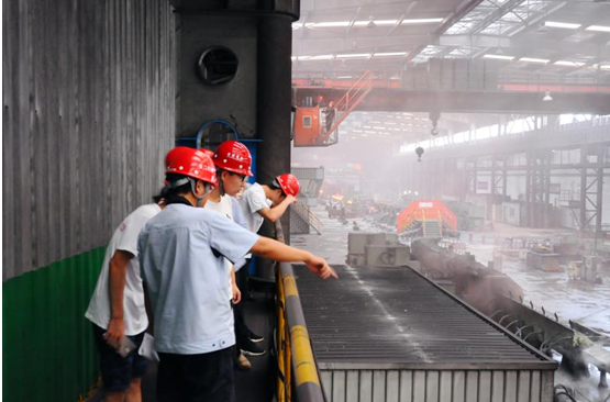 同學們在一邊參觀,一邊通過師傅現(xiàn)場講解,才真正了解到軋鋼的工藝流程并且知道了鋼板到底是怎么形成的。赤紅而超高溫的鋼板在生產(chǎn)線上快速運行,最后被切割成一段一段的,經(jīng)冷水冷卻后,這些基本板材,有的進入軋機進行軋制后做成鋼材卷板。當天,在高溫又環(huán)境惡劣的再熱軋現(xiàn)場中,令人有種“蒸桑拿”的錯覺。雖然大家早已汗流浹背,但即便如此,同學們?nèi)允潜3志瘢J真聆聽師傅的講解。當大學生們親眼目睹一道道工序的順利進行,直到鋼材一批批的成型,不由發(fā)出陣陣掌聲,既為工人師傅的精湛工藝和吃苦精神所感染,更深刻地體會到制造企業(yè)為社會主義生產(chǎn)力作出的貢獻。