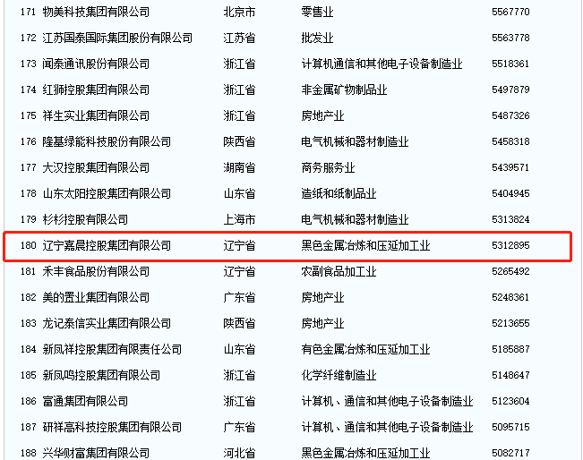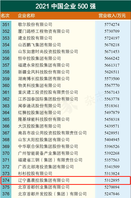 9月25日,以“新征程 新使命 新作為:全力推進(jìn)大企業(yè)高質(zhì)量發(fā)展”為主題的2021中國500強(qiáng)企業(yè)高峰論壇在中國長春市舉行。中國企業(yè)聯(lián)合會、中國企業(yè)家協(xié)會向社會發(fā)布“中國企業(yè)500強(qiáng)”名單,遼寧嘉晨控股集團(tuán)榜單排名374位。
